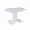Недорогая функциональная и стильная модель.  Каркас стола изготовлен из ЛДСП, цвет белый или венге. Столешница из МДФ с закаленным стеклом, матовым или глянцевым на выбор. Имеет полуовальную форму, размер 110 см с возможностью увеличения еще на 30 см. Опирается на одну ножку, переходящую в две плоские опоры на полу.